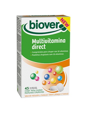 Biover Multivitamine direct fournit un complément adéquat de 10 vitamines. Ces comprimés à sucer ont une saveur pêche et maracuja agréable, en plus d'être très faciles à prendre.